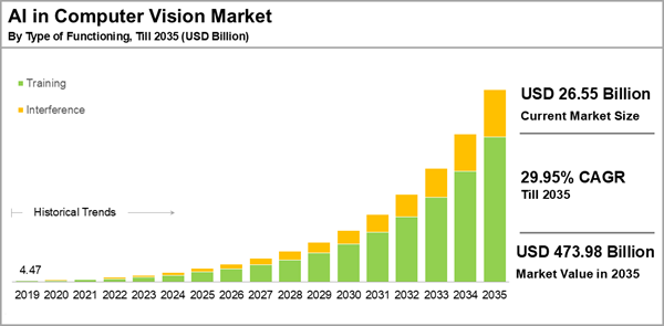 The global AI in computer vision market size is estimated to grow from USD 26.55 billion in 2025, to USD 473.98 billion by 2035, at a CAGR of 29.95% during the forecast period, till 2035.