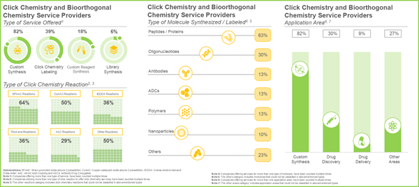 - Presently, close to 95% of the firms offer click chemistry reagents; of these, 63% of the companies are offering reagents that can be used for synthesis / labeling of biologics, including peptides and oligonucleotides.