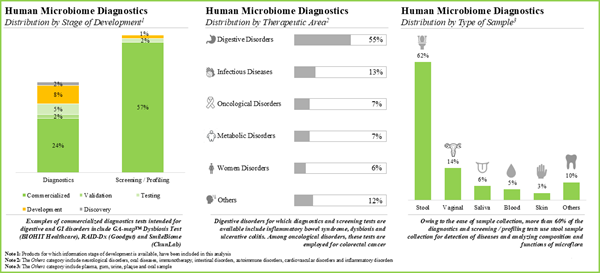 - Over 70 microbiome focused diagnostic and screening / profiling tests are available in the market; such test kits allow testing of different sample types across various therapeutic areas.