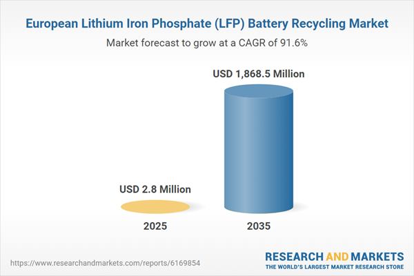 The Europe LFP battery recycling market is projected to reach $1.86 billion by 2035 from $1.8 million in 2024, growing at a CAGR of 91.56% during the forecast period 2025-2035