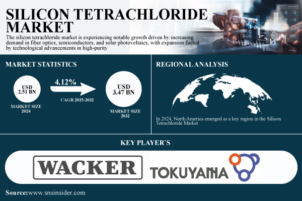Austin, Dec. 07, 2025 (GLOBE NEWSWIRE) -- According to SNS Insider, The Silicon Tetrachloride Market size was valued at USD 2.51 Billion in 2024 and is projected to reach USD 3.47 Billion by 2032, growing at a CAGR of 4.12% during 2025-2032. The market for silicon tetrachloride is expanding significantly due to rising demand in solar photovoltaics, semiconductors, and fiber optics. Technological developments in the production of high-purity chemicals and the growing use of renewable energy sources are also driving this growth.