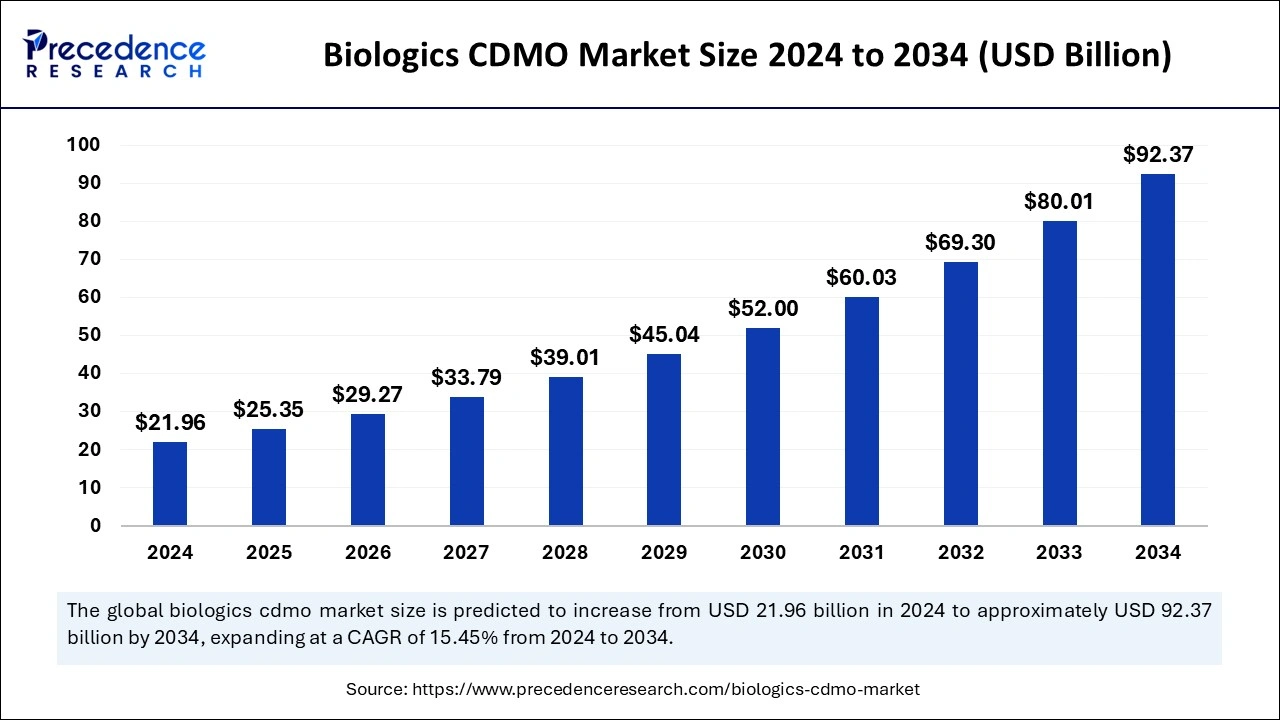 - The global biologics CDMO market was valued at USD 21.96 billion in 2024 and is projected to reach USD 92.37 billion by 2034, growing at a strong CAGR of 15.45%.