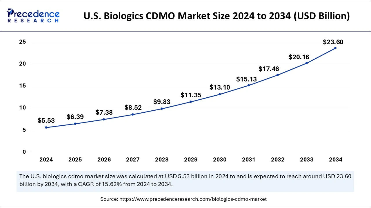 The U.S. biologics CDMO market size is valued at USD 6.39 billion in 2025 and is projected to be exceed over USD 23.60 billion by 2034, expanding at a double-digit CAGR of 15.62% from 2025 to 2034.