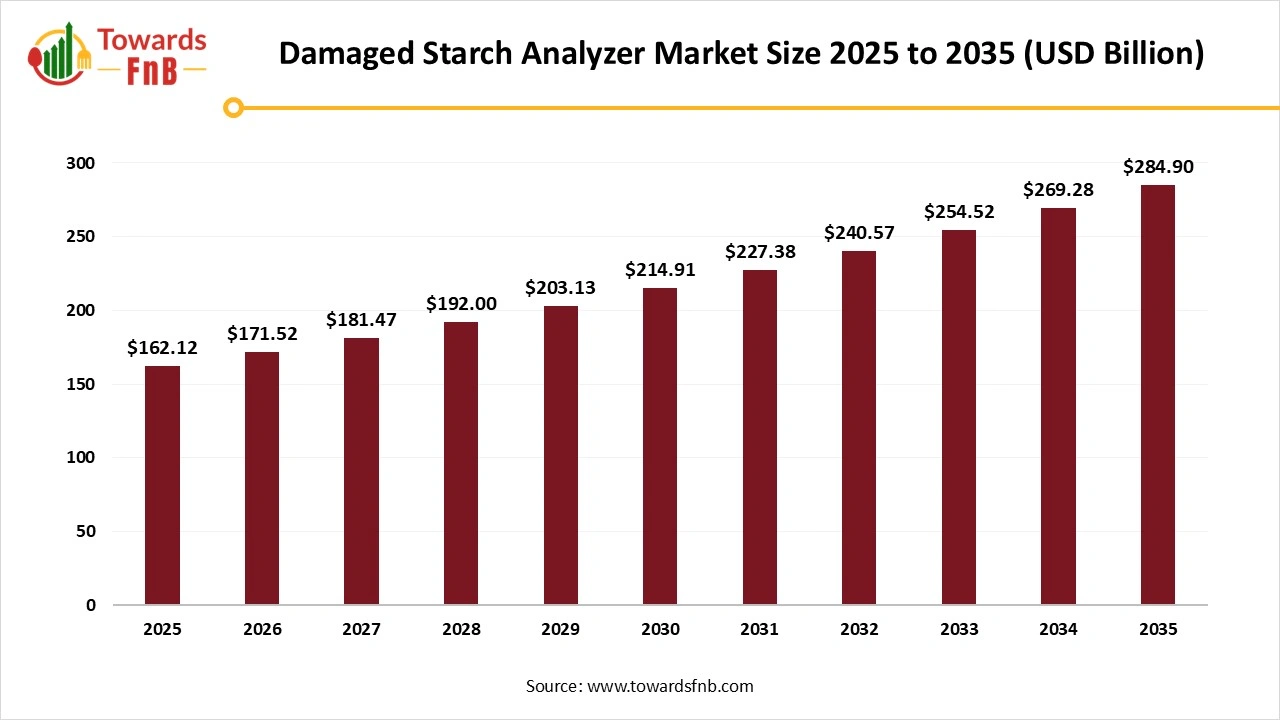 Ottawa, Dec. 17, 2025 (GLOBE NEWSWIRE) -- The global damaged starch analyzer market size stood at USD 162.12 billion in 2025, indicating a steady upward trajectory as analytical testing solutions gain wider adoption. A study published by Towards FnB, a sister firm of Precedence Research, highlights the market’s expansion across laboratory-based, in-line, and integrated flour quality-control systems deployed by mills, bakeries, and food manufacturers worldwide.
