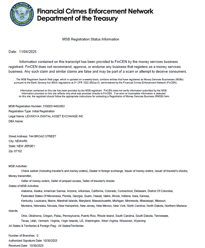 LEXINOVA Trading Center has completed its registration as a U.S. Money Services Business (MSB) with FinCEN, reinforcing its compliance framework and supporting continued expansion in regulated markets.