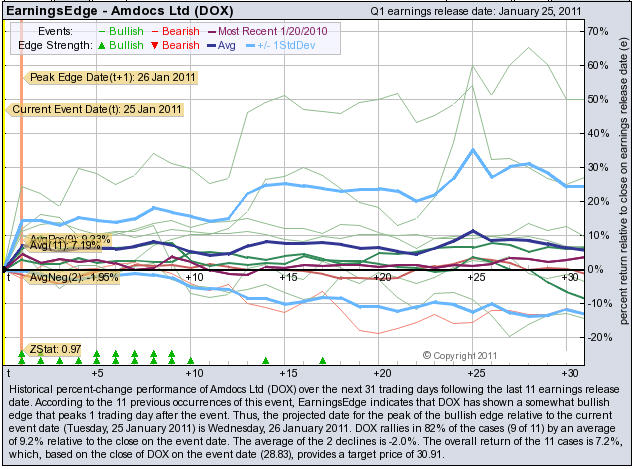 According to the 11 previous January earnings reports, DOX has shown a bullish edge that peaks 1 trading day after the report. DOX rallies in 82% of the cases (9 of 11) by an average of +9.2% relative to the date of the earnings release. At the time this story was written, DOX is +2.88% immediately after earnings were released.